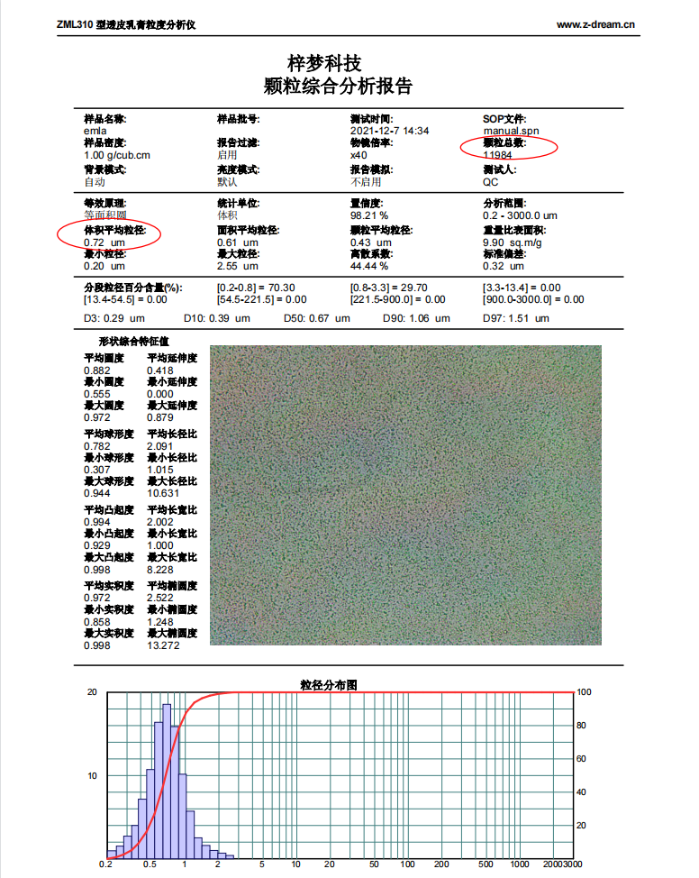 3)調(diào)節(jié)到最佳視野后利用透皮乳膏粒度分析儀ZML310分析軟件進行抓取圖片,識別圖片中的顆粒,并自動快速分析出顆粒數(shù)量,給出D10、D50、D90等參數(shù),識別視野中的顆粒并給出粒度分布,并可以按照不同的粒形進行過濾分析。