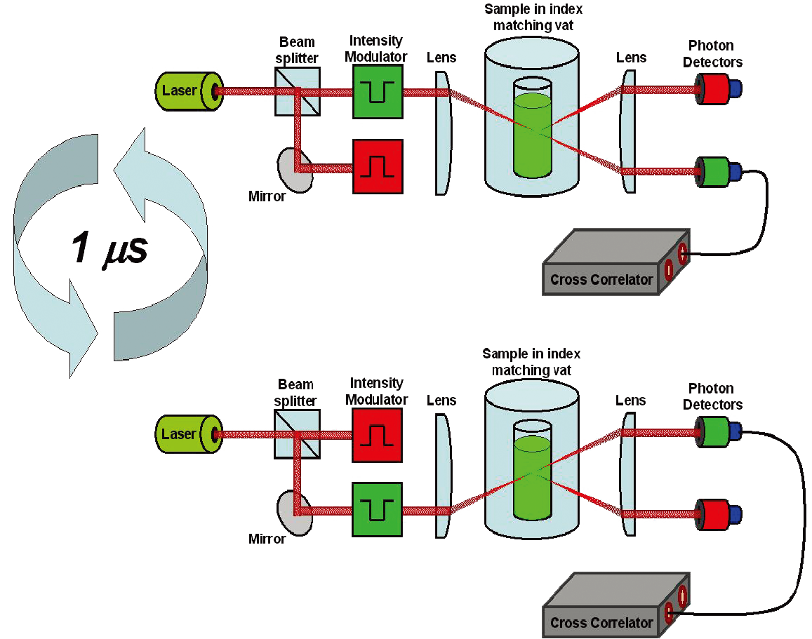 暫時性隔離每一光束-檢測器對,避免檢測器間的串擾和信號損失。入射光由控制器選擇性輸入,檢測器輸出在頻率(標準的調制頻率 500 kHz ? 2μs 的時間分辨率)超過系統動力學的時間尺度上被電子門控。門控輸出信號在等于或大于調制周期的時間標度里被互相關,從而得到精準的互相關函數。