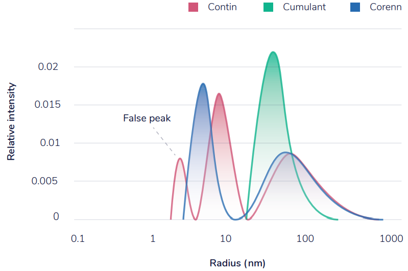 CORENN算法是一種用于從DLS測(cè)量中提取顆粒尺寸分布(PSD)的新型算法,也是利用先進(jìn)信號(hào)近似技術(shù)和對(duì)信號(hào)噪聲的獨(dú)特理論估計(jì)的DLS反演算法,可以產(chǎn)生非常可靠的結(jié)果,并對(duì)實(shí)驗(yàn)失真具有魯棒性,從而使最終用戶能夠從真實(shí)的DLS實(shí)驗(yàn)中獲取真實(shí)的PSD。左圖顯示了4nm和45nm顆粒混合物的DLS測(cè)量的三種算法結(jié)果對(duì)比,只有CORENN算法能夠正確地確定其分布。
