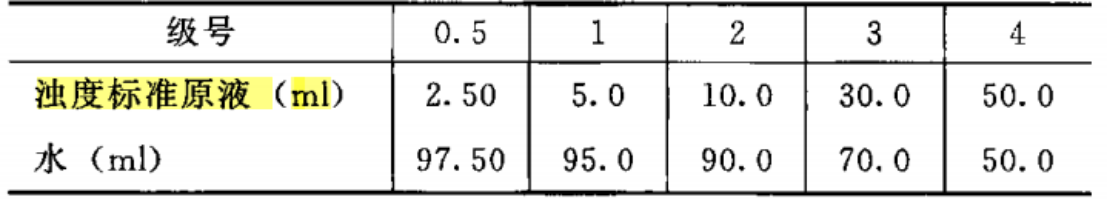 濁度標(biāo)準(zhǔn)液的制備:取濁度標(biāo)準(zhǔn)原液與水,按下表配制,即得。