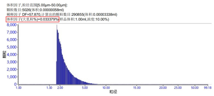 2)體積加權(quán)統(tǒng)計:直接輸出大乳粒的體積百分比,符合2025版《中國藥典》對PFAT5≤0.05%的判定要求