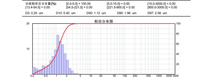 D50:1.12μm(50% 顆粒的粒徑小于此值,即中位徑),作為粒度分布的核心指標(biāo),此數(shù)值表明樣品中半數(shù)顆粒粒徑在 1.12μm 左右,處于外用制劑透皮吸收的適宜范圍;